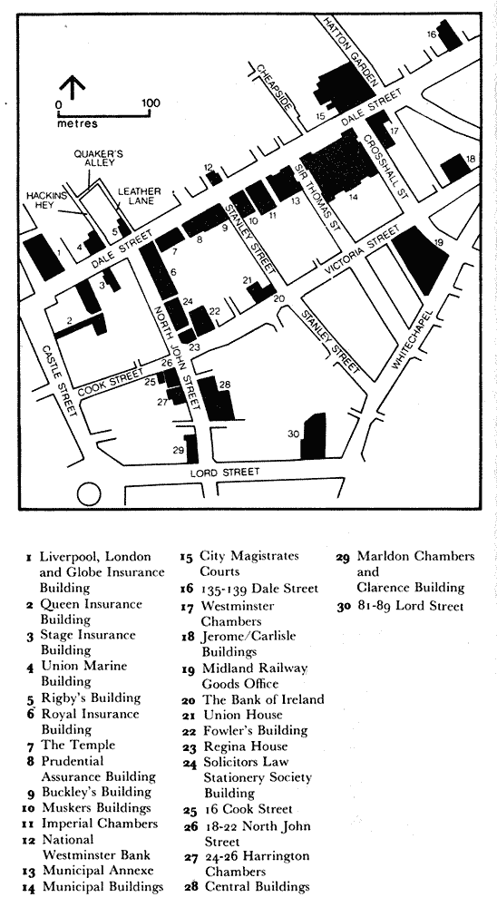 Rigby's Buildings including Hackins Hey, Quaker Alley and Leather Lane are worth examining, for although they contain no listed buildings they give an indication of the character of Liverpool before the main streets were widened.