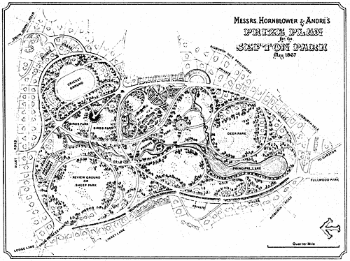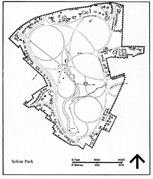 CONSERVATION AREA 11Sefton ParkIn 1866 the Corporation of Liverpool announced an international competition for the design and layout of a public park to the south of the City Centre. The winning design was submitted by M. Andre of Paris and Mr. Hornblower of Liverpool, and resulted in the creation of Liverpool's largest park, covering approximately 233 acres. The park was named after the Earl of Sefton, from whom the land was originally purchased, and was opened to the public in 1872. The site was originally composed entirely of agricultural land, devoid of trees or landscaping. The transformation into the present magnificent park illustrates the magnitude and quality of both the concept and its achievement.As a means of achieving a financial return, building sites were provided within the park. A number of villas, of which some eighty four remain, were erected as an integral part of the design, being neither a rigid boundary to the park nor intrusions into it. Although some of the villas are of great architectural merit, the majority are more of interest for their eccentric style and solid craftsmanship. A large number have been converted at various times into flats or institutional uses. ![]() Sefton Park Conservation Area was designated on 20 January 1971. It is considered 'outstanding* in the national context bv the Historic Building Council. The Palm House, 1896, built by Mackenzie & Moncur, iron founders of Edinburgh and Glasgow. Below, one of the large Victorian houses built around the edge of the park. ![]() The original design, which won the competition in 1867... ![]() | ||